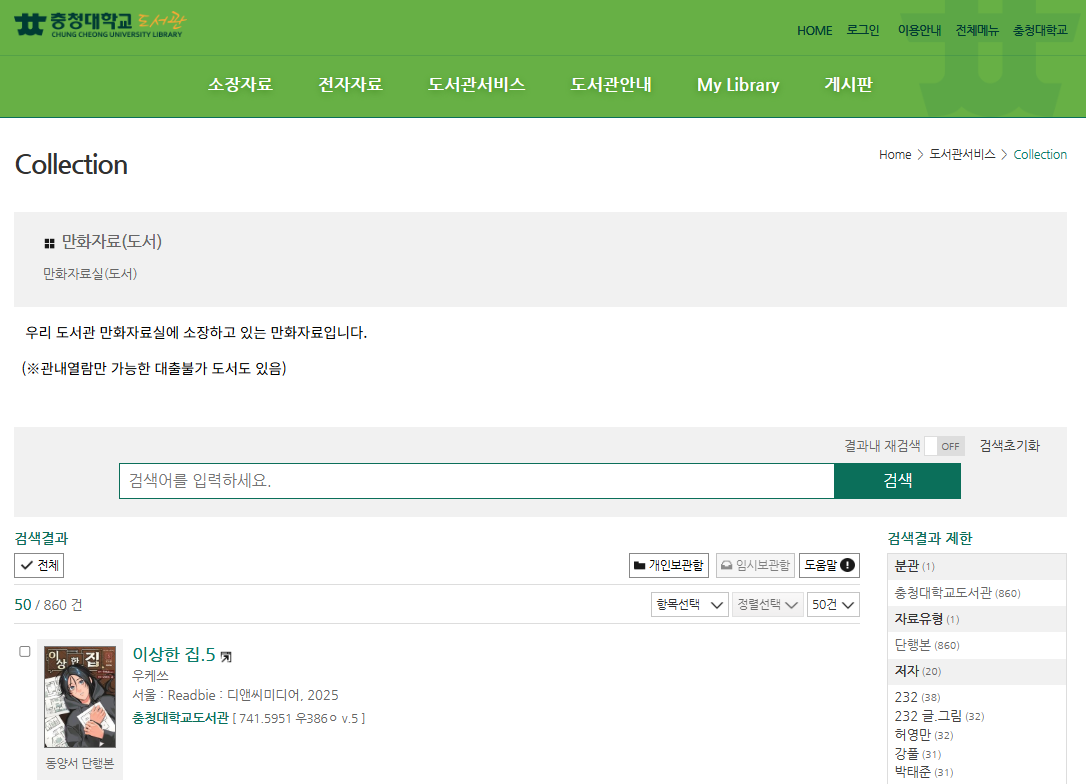 - 신착 만화자료는 대출가능합니다. 신착자료 보기 바로가기 -> https://clis.ok.ac.kr/#/sc/collection?scId1=5 |