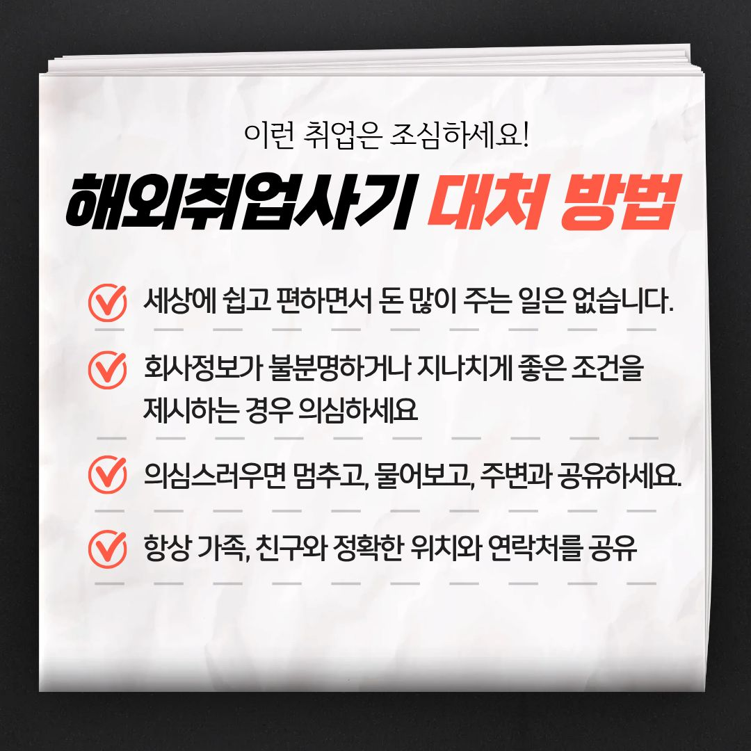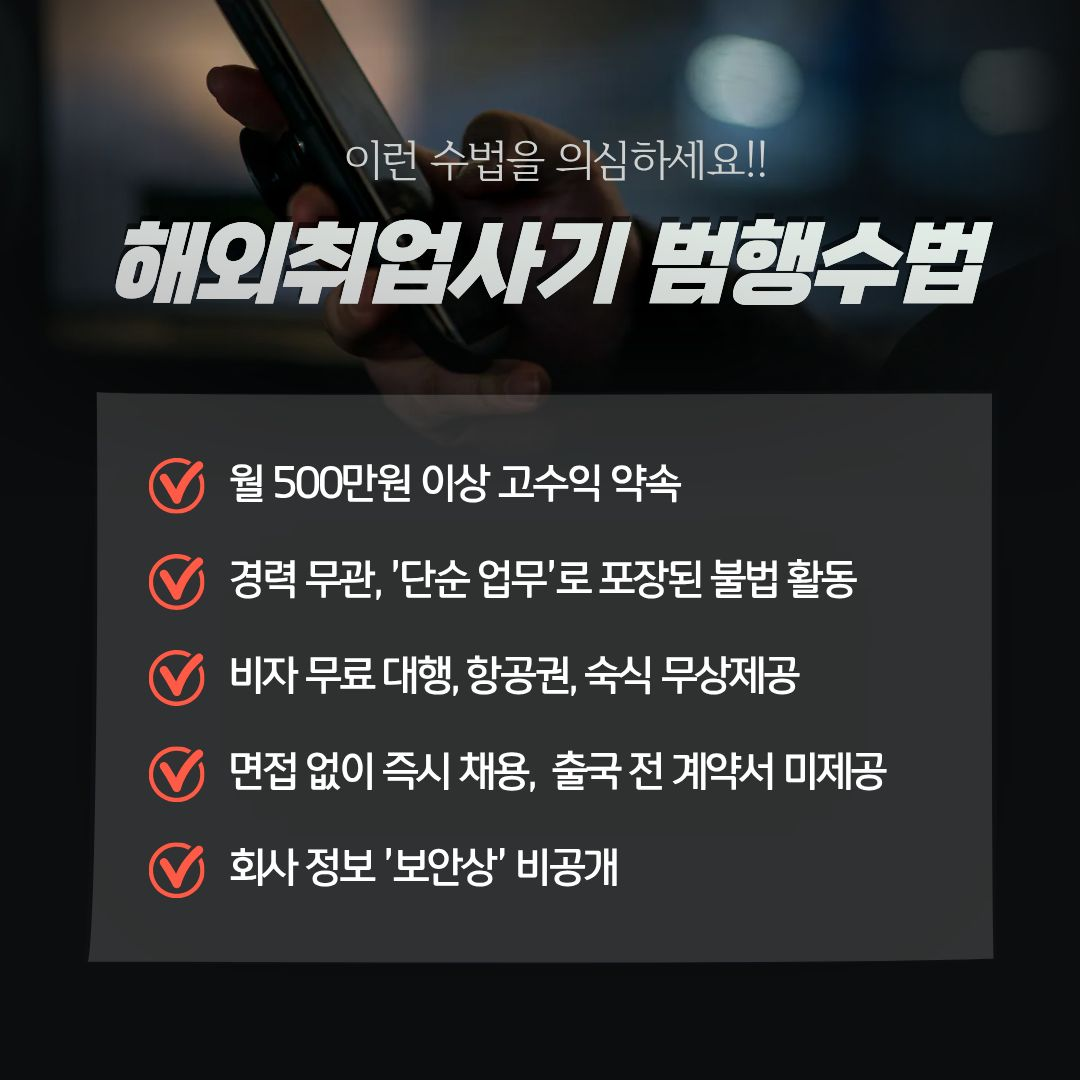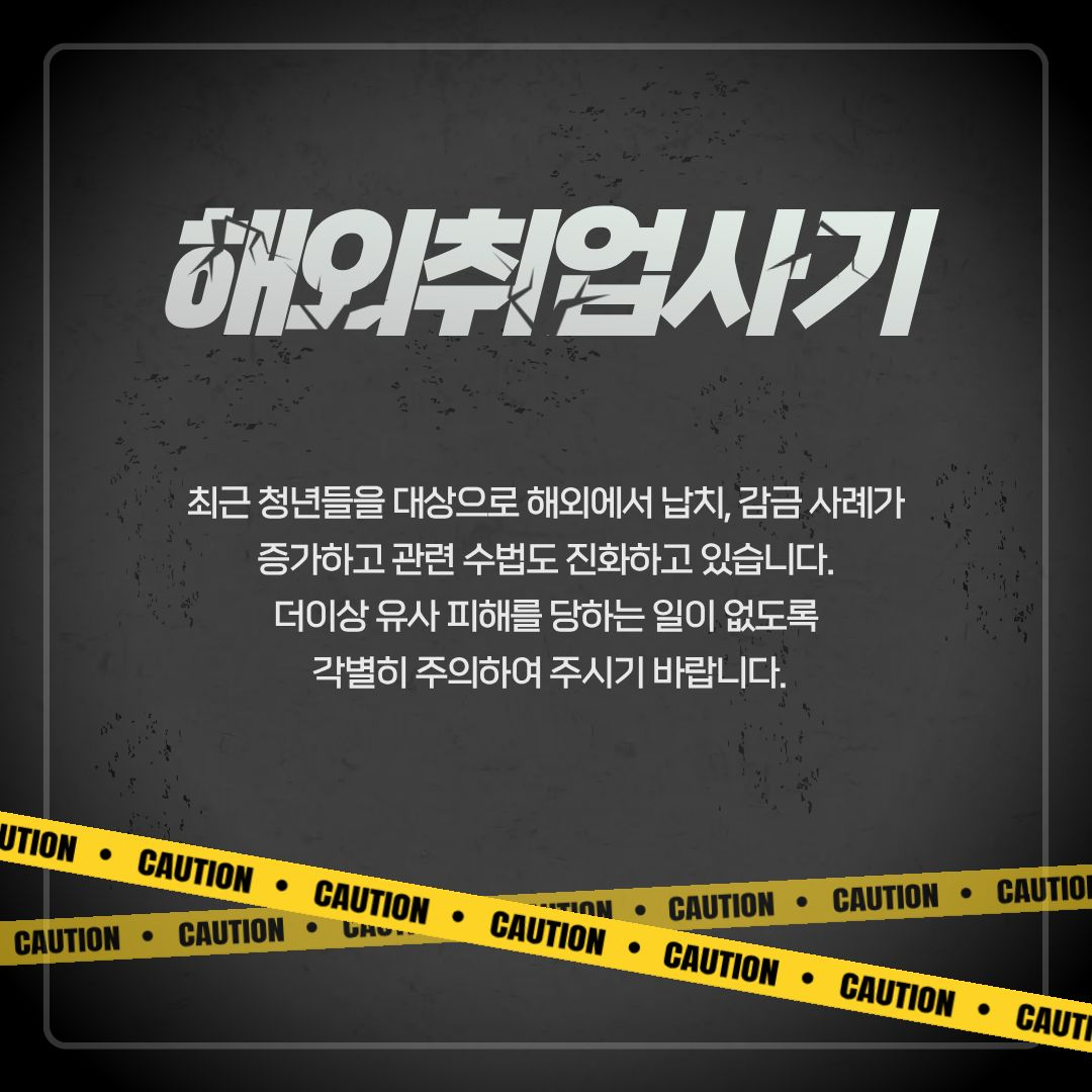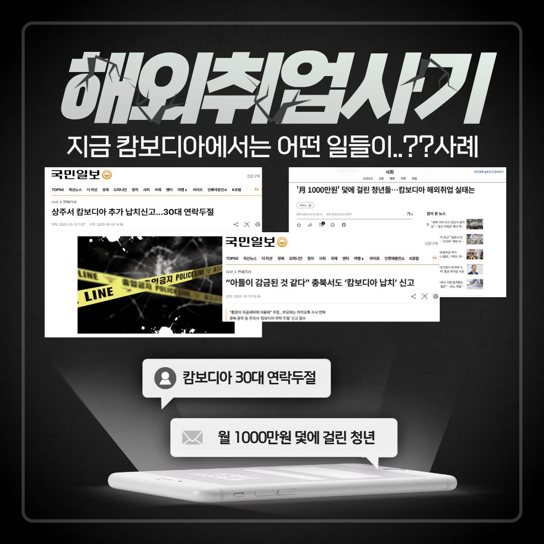 일반공지 학생공지 일반공지 장학/학자금 공지 감염병안내 공모/모집/시험 도서관 생활관 기부금공개 업무추진비공개 보육교원연수원 기타공고 충청대학교_대표-학생공지(대표_충청마당_공지사항_학생공지) 상세보기 - 제목, 내용, 파일, 작성자, 조회수, 작성일, 학과공지, 주소링크 정보 제공 [노란화분] 해외 취업 사기 범죄 예방 안내 작성자 : 이정민 작성일 : 2025-10-23 조회 : 66 최근 해외 취업 사기 범죄가 심각합니다. 주의하세요. 파일 png 문서 캄보디아 범죄 예방1.png png 문서 캄보디아 범죄예방 2.png png 문서 캄보디아 범죄예방 3.png png 문서 캄보디아 범죄 예방 4.png png 문서 캄보디아 범죄예방 5.png 주소링크 목록 게시물삭제 광고 반복작성 욕설 본인삭제 게시물삭제 다음글 【취업허브센터】 2025년 졸업특화프로그램 『인적성 시험 꿀팁 대방출 프로젝트』 운영 안내